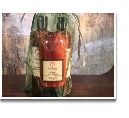 A GIFT BAG CONTAINING A 4 OZ BODY LOTION, AND 8 OZ SHAMPOO AND AN 8 OZ CONDITIONER IN OUR MANCAVE BLEND ~ THIS FEEL GOOD BLEND OF FRANKINCENSE CEDARWOOD PATCHOULI & LIME OILS HELP GROUND & MOTIVATE YOUR ENERGY FOR INSPIRATION & SUCCESS THROUGHOUT YOUR DAY.